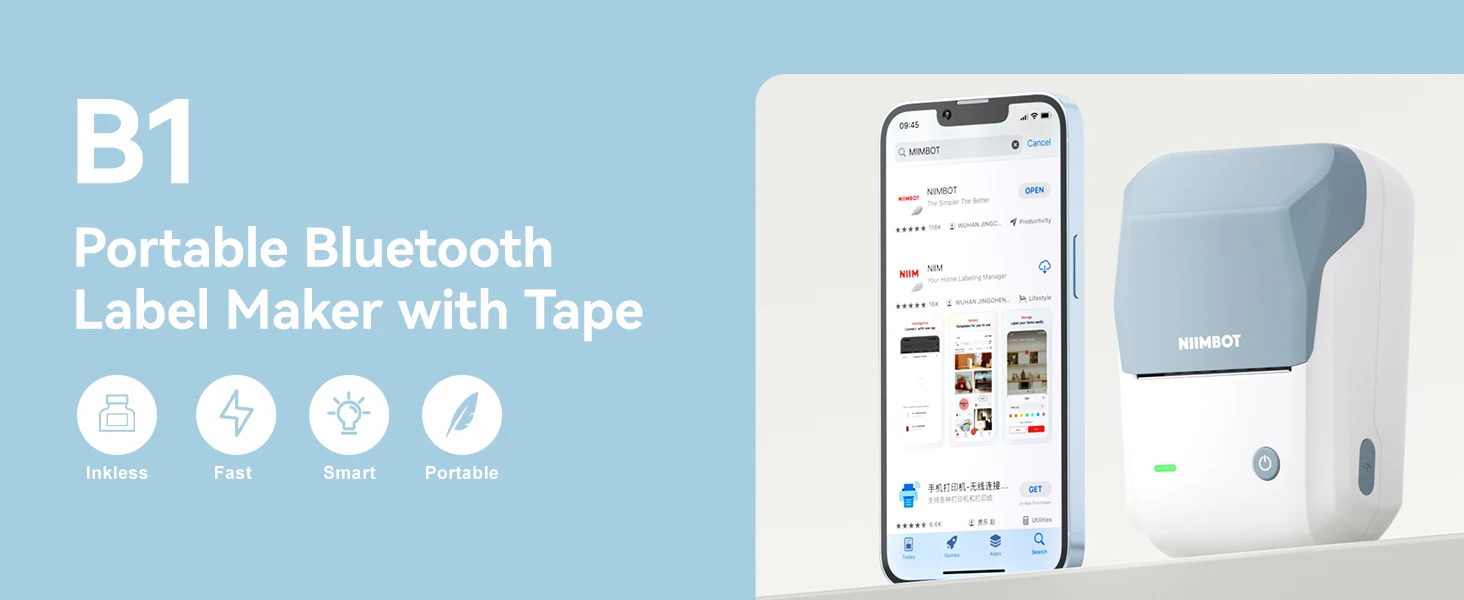 INKLESS LABEL MAKER:BPA-free Direct thermal technology. NIIMBOT B1 label maker machine with tape, 1.96*1.18 inch (50x30 mm). B1 label printer support label width 0.8''-2''. mini label maker size: 5.2*3.6*2.4 inch(13*9*6 cm). Weight: 0.7lb.